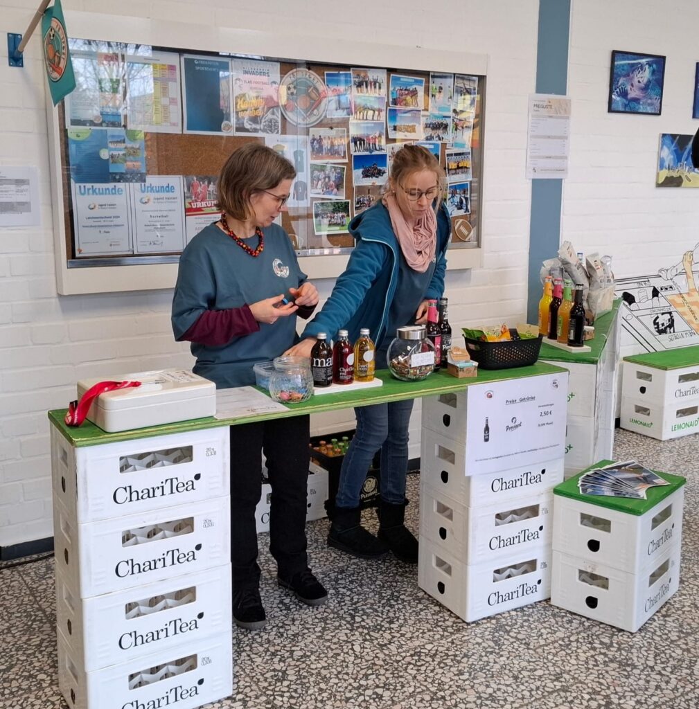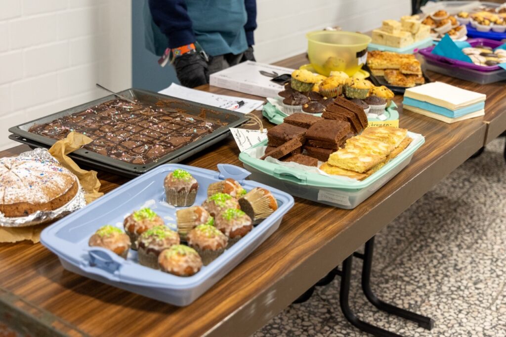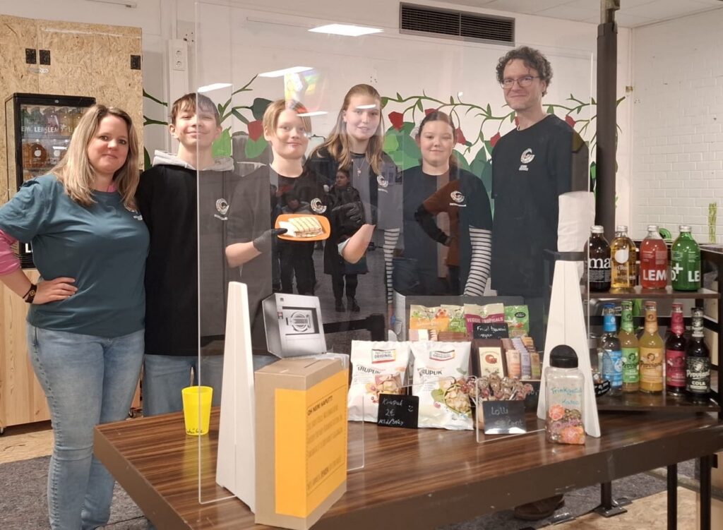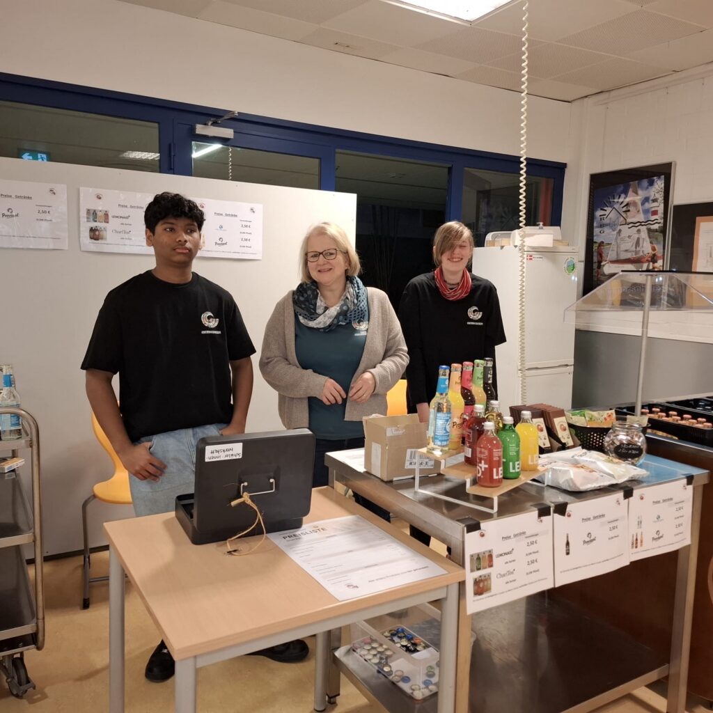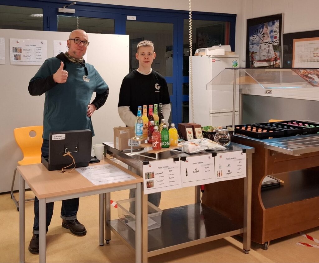 Für das leibliche Wohl sorgten an diesem Tag Eltern, Schüler:innen und Lehrkräfte, die den ganzen Tag im Einsatz waren und warme Speisen, Getränke und Snacks verkauften. Das Angebot war vielfältig. So gab es vom Mensa-Team Hot Dogs und diverse andere warme Gerichte, die Schülerfirma verkaufte Snacks, Pizza, Wraps und Getränke, die Aarö-AG bot Popcorn an, die UNESCO-AG sorgte für Waffeln, die Hausmeister verköstigten die Gäste mit Bratwurst und Pommes, die Oberstufe verkaufte die von Eltern gespendeten Kuchen und viele Eltern unterstützten beim Verkauf an diversen Stellen.