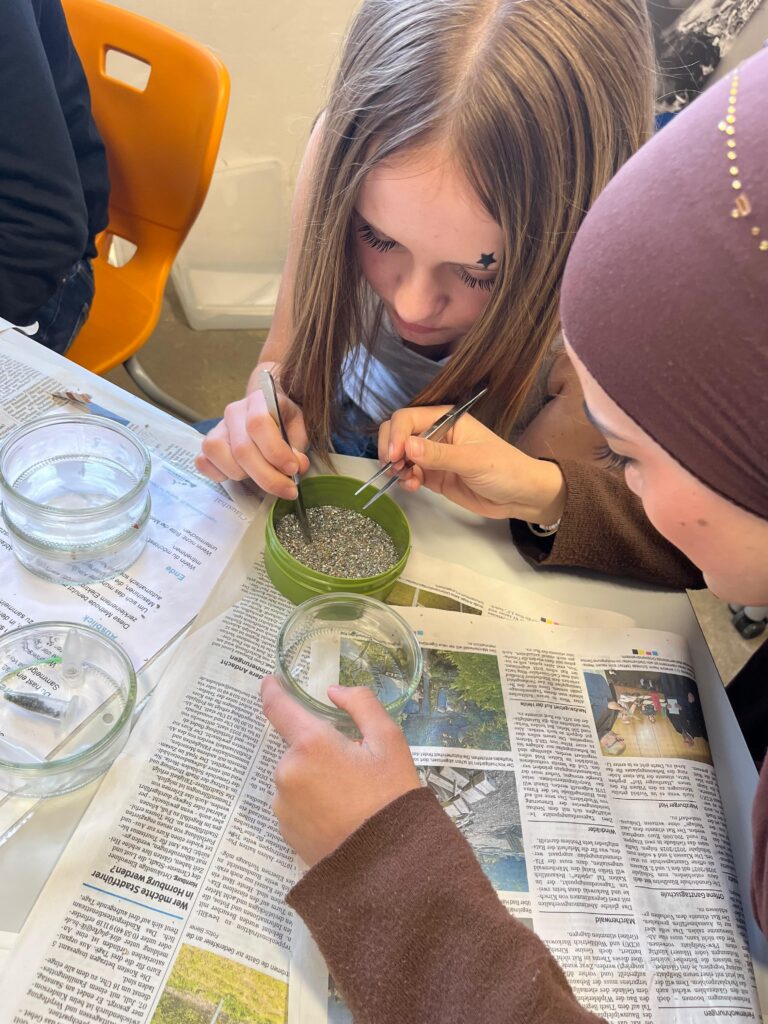 Doch das Bergwerk ist stillgelegt. Der größte Teil der Rohstoffe ist bereits abgebaut. Ein weiterer Betrieb lohnt sich nicht mehr. Und das bei immer weiter steigendem Bedarf an Metallen für die wachsende Elektronikindustrie. Die Lösung liegt auf der Hand: Recycling – also die Wiederverwertung bereits genutzter Rohstoffe. Und das ist gar nicht so weit von dem entfernt, was die Bergleute damals machten, um aus dem wertlosen Gestein wertvolles Kupfer oder Silber zu gewinnen. Unter dem Motto „E-Schrott, das Erz der Zukunft“ untersuchten die Schüler:innen, wie wertvolle Metalle aus Gestein und auch aus Elektroschrott gewonnen werden können. Mit Sieben, Magneten, Reagenzgläsern und viel Forschergeist probierten sie physikalische und chemische Methoden aus, um Kupfer und andere Metalle von „wertlosem“ Gestein oder Plastikschrott zu trennen. Dabei erkannten sie, dass Eigenschaften wie Magnetismus, Wasserlöslichkeit, Aussehen und Dichte nicht nur im Bergbau, sondern auch beim Recycling von Elektroschrott entscheidende Rollen spielen.
