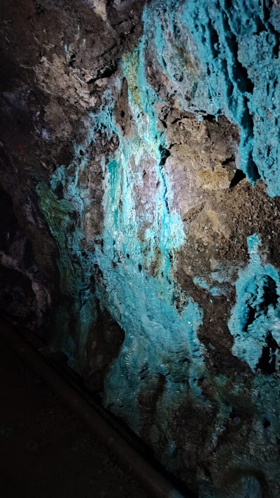 Aber der Berg ist nicht nur grau und trist: von den Felswänden schimmerten im Licht der Grubenlampe leuchtend blaue und grüne Vitriolkristalle aus Kupfer, Eisen, Mangan und Zink. Hinweise auf den Reichtum unter Tage, der das Bergwerk Rammelsberg zu einem der größten Europas gemacht hat.